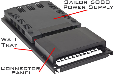 SAILOR 6080 units. The connectors for DC power are placed at the same end of the unit for easy mounting and installation. The connection between the Power Supply unit(s) and the connector panel are protected against water ingress by a protection cover. A cable relief bracket to secure heavy cables is integrated in the wall-mount tray. When mounted vertically the Power Supply Unit and Charger and the SAILOR 6080 Power Supply fulfill IP32 in areas with more than 42 V and IP22 in other areas.
